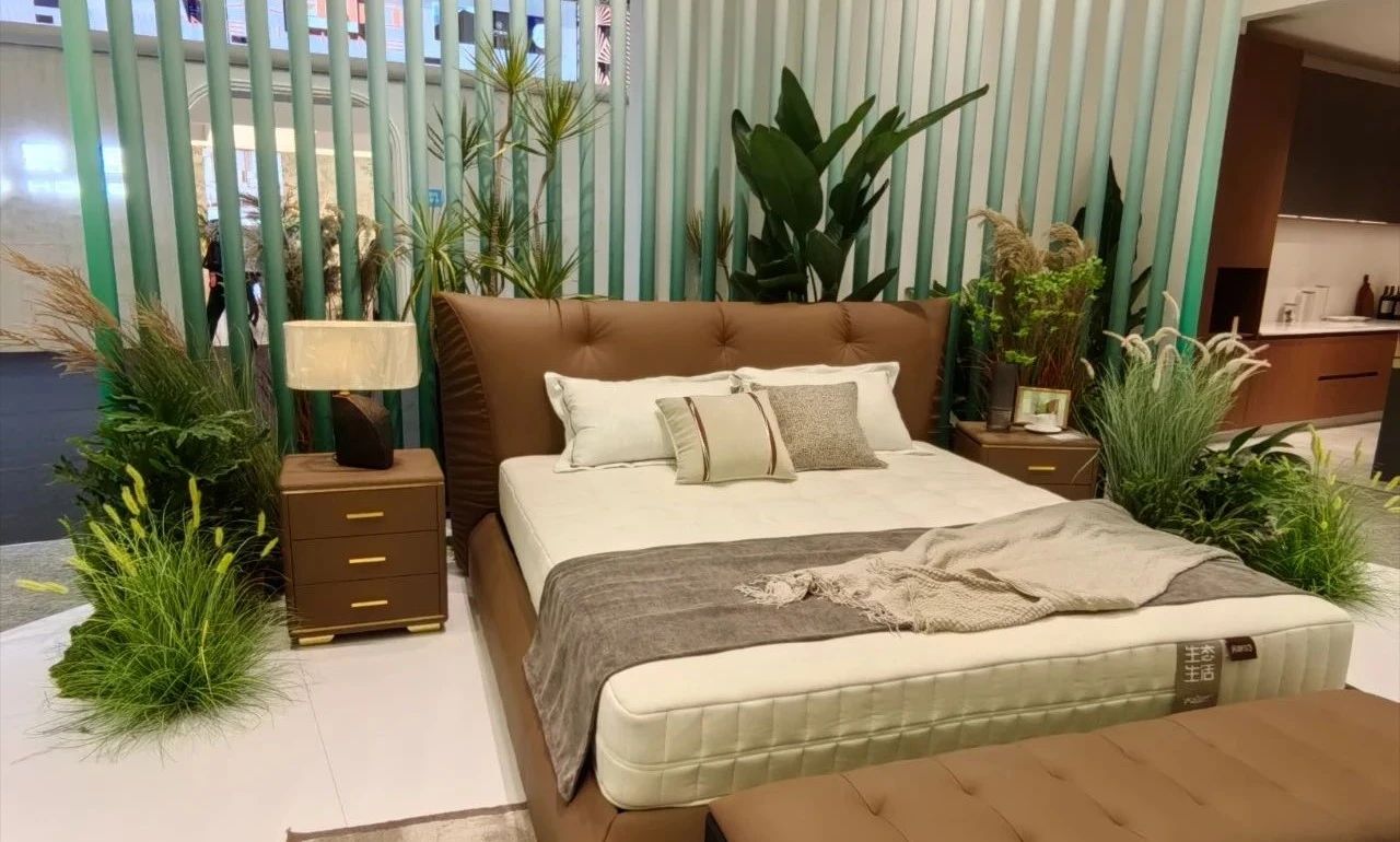 展會(huì)開展首日,琶洲展館內(nèi)人流如織,來自全球的經(jīng)銷商、設(shè)計(jì)師及消費(fèi)者齊聚一堂。大自然床墊以“生態(tài)生活”為設(shè)計(jì)理念打造的沉浸式主題展館成為全場(chǎng)焦點(diǎn)。展區(qū)通過天然棕床墊、生態(tài)整家定制與生態(tài)原木家具的結(jié)合,模擬出臥室、客廳等居家場(chǎng)景,吸引眾多觀眾駐足體驗(yàn)。
